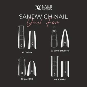 Τα Sandwich Dual Forms της NC Nails κυκλοφόρησαν ειδικά σχεδιασμένα για να διευκολύνουν την εργασία σας και να αποτρέψουν την επεξεργασία στο κάτω μέρος του νυχιού, εξασφαλίζοντας ένα απόλυτα ασφαλές και εύκολο αποτέλεσμα. Το υλικό σφραγίζεται με ακρίβεια ανάμεσα σε δύο ειδικές φόρμες, δημιουργώντας μια εξαιρετικά λεία βάση με ομοιόμορφο πάχος σε όλο το μήκος και μια άψογη αρχιτεκτονική που εγγυάται επαγγελματικό φινίρισμα. Διατίθενται σε 16 διαφορετικά μεγέθη, ώστε να μπορείτε να τα προσαρμόσετε εύκολα και γρήγορα σε κάθε φυσικό νύχι, ανεξαρτήτως σχήματος ή μεγέθους. Είναι εξαιρετικά ανθεκτικά και επαναχρησιμοποιούμενα, κατασκευασμένα από υψηλής ποιότητας διάφανο πλαστικό που προσφέρει οπτική επαφή καθ’ όλη τη διαδικασία εφαρμογής. Κυκλοφορούν σε τέσσερα δημοφιλή σχήματα, ενώ κάθε κασετίνα περιλαμβάνει 256 τεμάχια ανά σχήμα, παρέχοντας άφθονο απόθεμα για επαγγελματική χρήση!